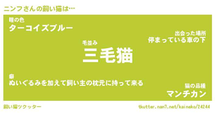 ニンフさんの飼い猫は… 毛並み『三毛猫』瞳の色『ターコイズブルー』猫の品種『マンチカン』 ツクッター #飼い猫ツクッター http://tkutter.nan7.net/kaineko/24244/