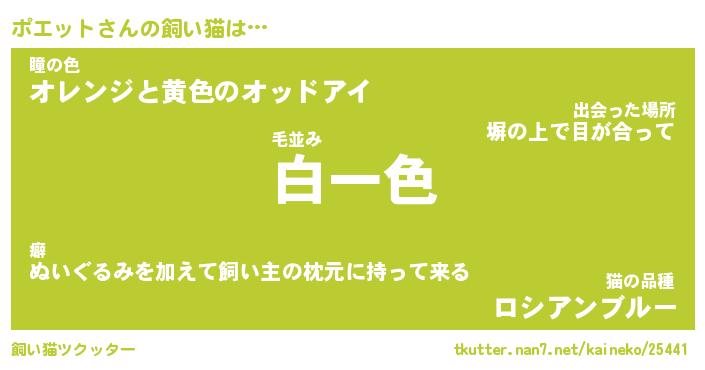 ポエットさんの飼い猫は… 毛並み『白一色』瞳の色『オレンジと黄色のオッドアイ』猫の品種『ロシアンブルー』 ツクッター #飼い猫ツクッター http://tkutter.nan7.net/kaineko/25441/