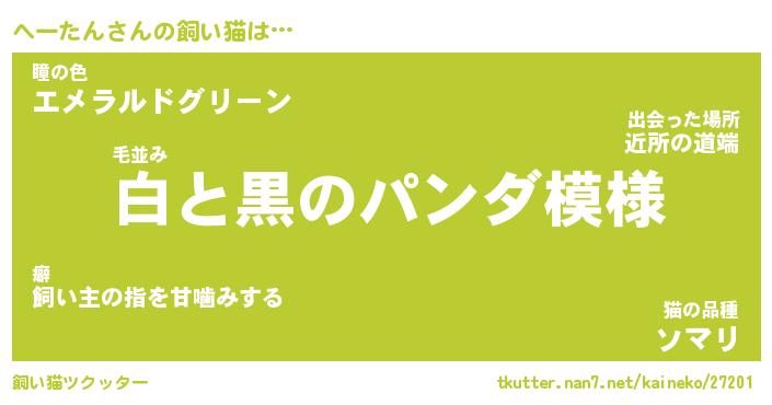 へーたんさんの飼い猫は… 毛並み『白と黒のパンダ模様』瞳の色『エメラルドグリーン』猫の品種『ソマリ』 ツクッター #飼い猫ツクッター http://tkutter.nan7.net/kaineko/27201/