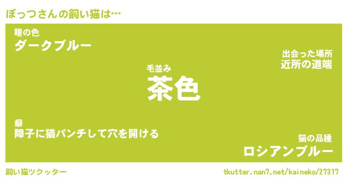 ぼっつさんの飼い猫は… 毛並み『茶色』瞳の色『ダークブルー』猫の品種『ロシアンブルー』 ツクッター #飼い猫ツクッター http://tkutter.nan7.net/kaineko/27317/