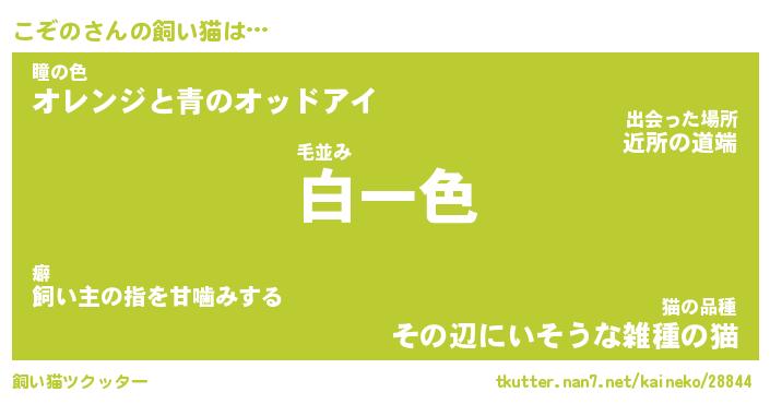 こぞのさんの飼い猫は… 毛並み『白一色』瞳の色『オレンジと青のオッドアイ』猫の品種『その辺にいそうな雑種の猫』 ツクッター #飼い猫ツクッター http://tkutter.nan7.net/kaineko/28844/