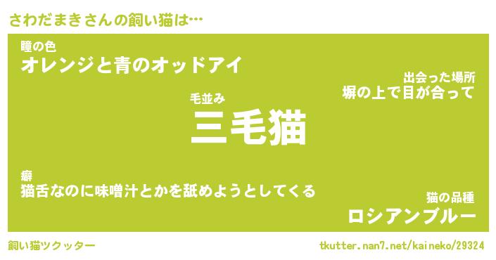 さわだまきさんの飼い猫は… 毛並み『三毛猫』瞳の色『オレンジと青のオッドアイ』猫の品種『ロシアンブルー』 ツクッター #飼い猫ツクッター http://tkutter.nan7.net/kaineko/29324/