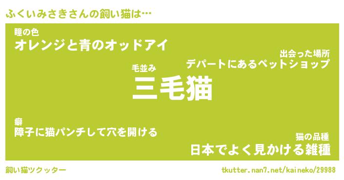 ふくいみさきさんの飼い猫は… 毛並み『三毛猫』瞳の色『オレンジと青のオッドアイ』猫の品種『日本でよく見かける雑種』 ツクッター #飼い猫ツクッター http://tkutter.nan7.net/kaineko/29988/