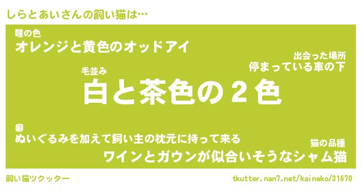 しらとあいさんの飼い猫は… 毛並み『白と茶色の2色』瞳の色『オレンジと黄色のオッドアイ』猫の品種『ワインとガウンが似合いそうなシャム猫』 ツクッター #飼い猫ツクッター http://tkutter.nan7.net/kaineko/31670/