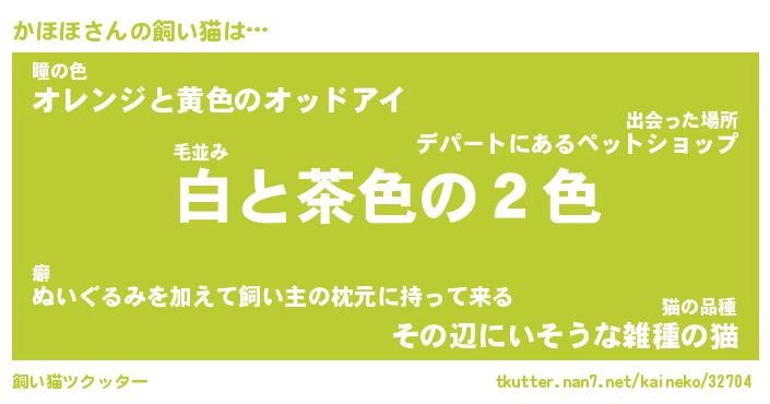 かほほさんの飼い猫は… 毛並み『白と茶色の2色』瞳の色『オレンジと黄色のオッドアイ』猫の品種『その辺にいそうな雑種の猫』 ツクッター #飼い猫ツクッター http://tkutter.nan7.net/kaineko/32704/