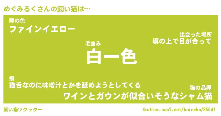 めぐみるくさんの飼い猫は… 毛並み『白一色』瞳の色『ファインイエロー』猫の品種『ワインとガウンが似合いそうなシャム猫』 ツクッター #飼い猫ツクッター http://tkutter.nan7.net/kaineko/35541/