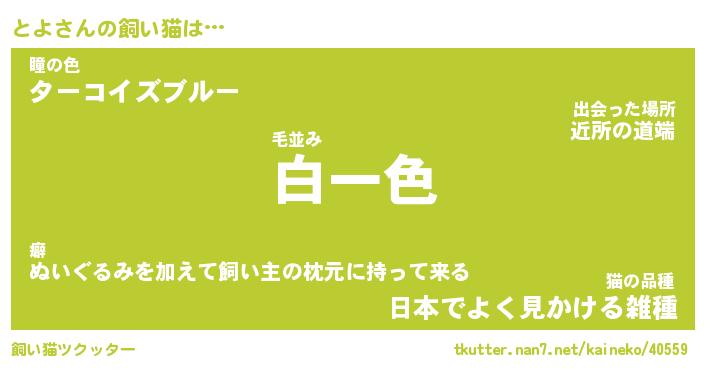 とよさんの飼い猫は… 毛並み『白一色』瞳の色『ターコイズブルー』猫の品種『日本でよく見かける雑種』 ツクッター #飼い猫ツクッター http://tkutter.nan7.net/kaineko/40559/