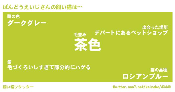 ばんどうえいじさんの飼い猫は… 毛並み『茶色』瞳の色『ダークグレー』猫の品種『ロシアンブルー』 ツクッター #飼い猫ツクッター http://tkutter.nan7.net/kaineko/43440/