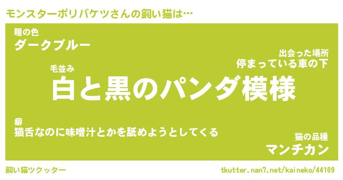 モンスターポリバケツさんの飼い猫は… 毛並み『白と黒のパンダ模様』瞳の色『ダークブルー』猫の品種『マンチカン』 ツクッター #飼い猫ツクッター http://tkutter.nan7.net/kaineko/44109/