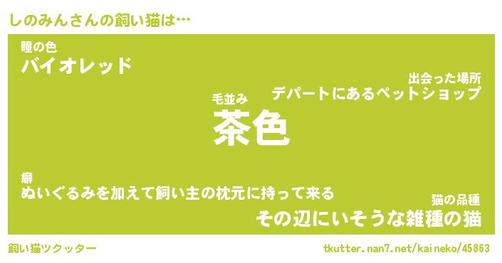 しのみんさんの飼い猫は… 毛並み『茶色』瞳の色『バイオレッド』猫の品種『その辺にいそうな雑種の猫』 ツクッター #飼い猫ツクッター http://tkutter.nan7.net/kaineko/45863/