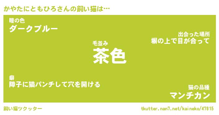 かやたにともひろさんの飼い猫は… 毛並み『茶色』瞳の色『ダークブルー』猫の品種『マンチカン』 ツクッター #飼い猫ツクッター http://tkutter.nan7.net/kaineko/47815/