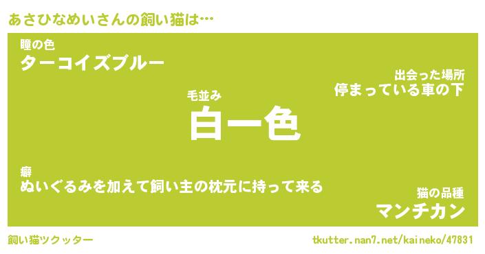 あさひなめいさんの飼い猫は… 毛並み『白一色』瞳の色『ターコイズブルー』猫の品種『マンチカン』 ツクッター #飼い猫ツクッター http://tkutter.nan7.net/kaineko/47831/