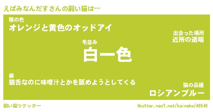 えぱみなんだすさんの飼い猫は… 毛並み『白一色』瞳の色『オレンジと黄色のオッドアイ』猫の品種『ロシアンブルー』 ツクッター #飼い猫ツクッター http://tkutter.nan7.net/kaineko/48545/