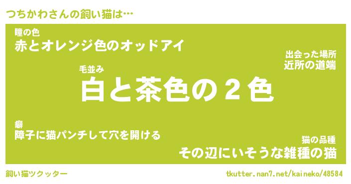 つちかわさんの飼い猫は… 毛並み『白と茶色の2色』瞳の色『赤とオレンジ色のオッドアイ』猫の品種『その辺にいそうな雑種の猫』 ツクッター #飼い猫ツクッター http://tkutter.nan7.net/kaineko/48584/
