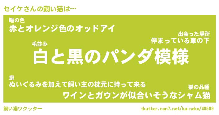 セイケさんの飼い猫は… 毛並み『白と黒のパンダ模様』瞳の色『赤とオレンジ色のオッドアイ』猫の品種『ワインとガウンが似合いそうなシャム猫』 ツクッター #飼い猫ツクッター http://tkutter.nan7.net/kaineko/48589/
