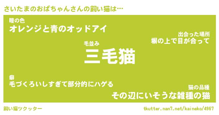 さいたまのおばちゃんさんの飼い猫は… 毛並み『三毛猫』瞳の色『オレンジと青のオッドアイ』猫の品種『その辺にいそうな雑種の猫』 ツクッター #飼い猫ツクッター http://tkutter.nan7.net/kaineko/4967/