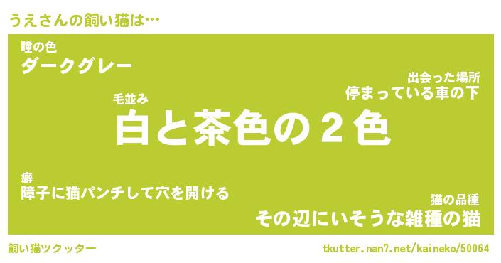 うえさんの飼い猫は… 毛並み『白と茶色の2色』瞳の色『ダークグレー』猫の品種『その辺にいそうな雑種の猫』 ツクッター #飼い猫ツクッター http://tkutter.nan7.net/kaineko/50064/