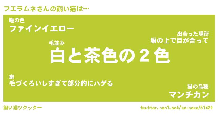 フエラムネさんの飼い猫は… 毛並み『白と茶色の2色』瞳の色『ファインイエロー』猫の品種『マンチカン』 ツクッター #飼い猫ツクッター http://tkutter.nan7.net/kaineko/51420/