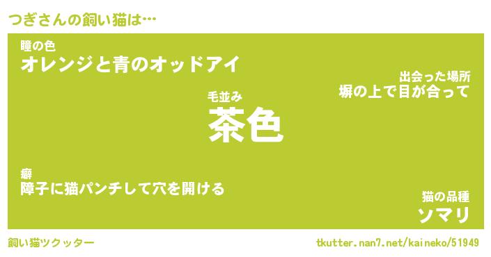 つぎさんの飼い猫は… 毛並み『茶色』瞳の色『オレンジと青のオッドアイ』猫の品種『ソマリ』 ツクッター #飼い猫ツクッター http://tkutter.nan7.net/kaineko/51949/