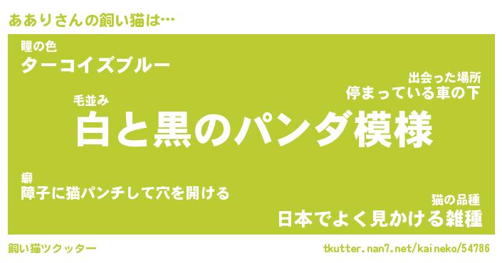 あありさんの飼い猫は… 毛並み『白と黒のパンダ模様』瞳の色『ターコイズブルー』猫の品種『日本でよく見かける雑種』 ツクッター #飼い猫ツクッター http://tkutter.nan7.net/kaineko/54786/