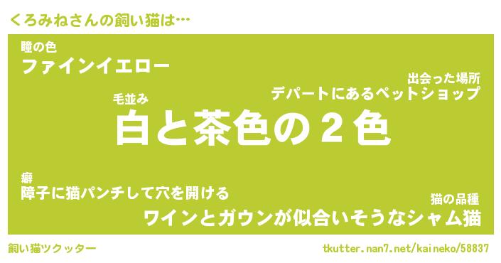 くろみねさんの飼い猫は… 毛並み『白と茶色の2色』瞳の色『ファインイエロー』猫の品種『ワインとガウンが似合いそうなシャム猫』 ツクッター #飼い猫ツクッター http://tkutter.nan7.net/kaineko/58837/