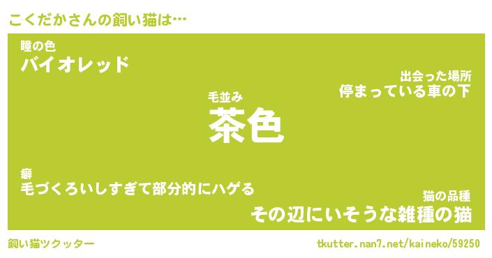 こくだかさんの飼い猫は… 毛並み『茶色』瞳の色『バイオレッド』猫の品種『その辺にいそうな雑種の猫』 ツクッター #飼い猫ツクッター http://tkutter.nan7.net/kaineko/59250/