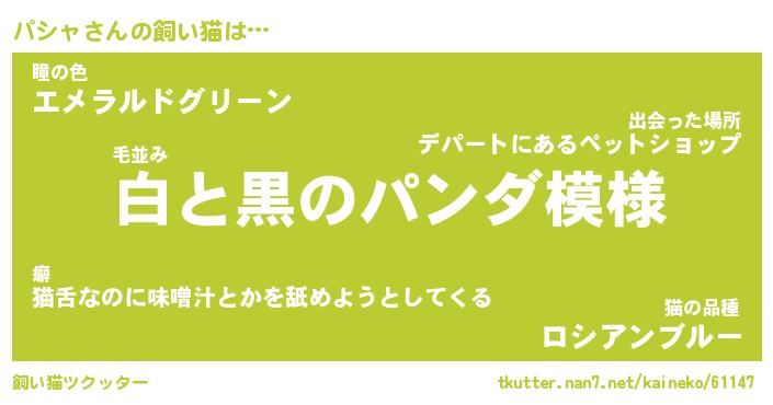 パシャさんの飼い猫は… 毛並み『白と黒のパンダ模様』瞳の色『エメラルドグリーン』猫の品種『ロシアンブルー』 ツクッター #飼い猫ツクッター http://tkutter.nan7.net/kaineko/61147/