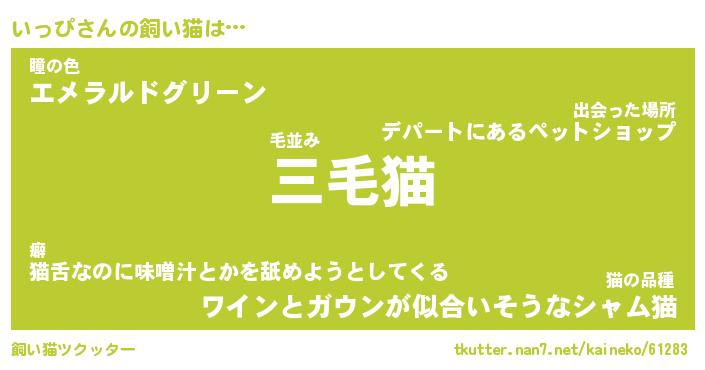 いっぴさんの飼い猫は… 毛並み『三毛猫』瞳の色『エメラルドグリーン』猫の品種『ワインとガウンが似合いそうなシャム猫』 ツクッター #飼い猫ツクッター http://tkutter.nan7.net/kaineko/61283/