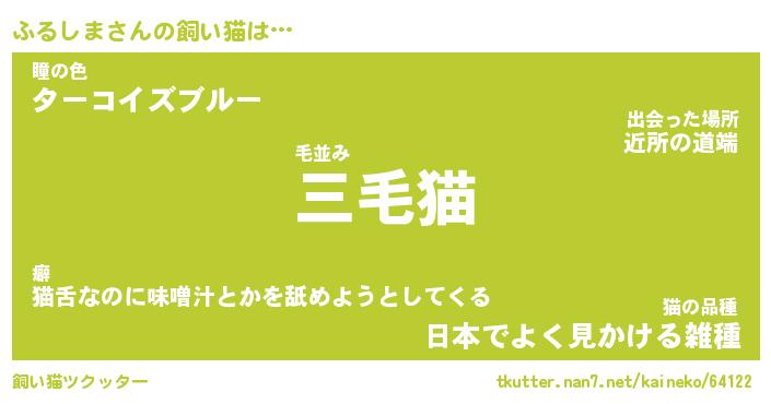 ふるしまさんの飼い猫は… 毛並み『三毛猫』瞳の色『ターコイズブルー』猫の品種『日本でよく見かける雑種』 ツクッター #飼い猫ツクッター http://tkutter.nan7.net/kaineko/64122/