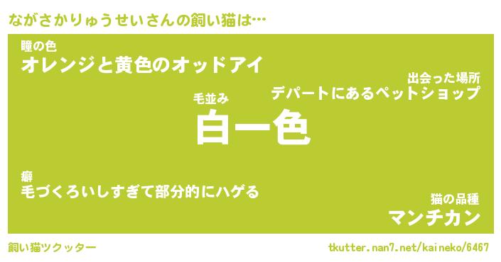 ながさかりゅうせいさんの飼い猫は… 毛並み『白一色』瞳の色『オレンジと黄色のオッドアイ』猫の品種『マンチカン』 ツクッター #飼い猫ツクッター http://tkutter.nan7.net/kaineko/6467/