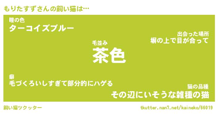 もりたすずさんの飼い猫は… 毛並み『茶色』瞳の色『ターコイズブルー』猫の品種『その辺にいそうな雑種の猫』 ツクッター #飼い猫ツクッター http://tkutter.nan7.net/kaineko/66019/