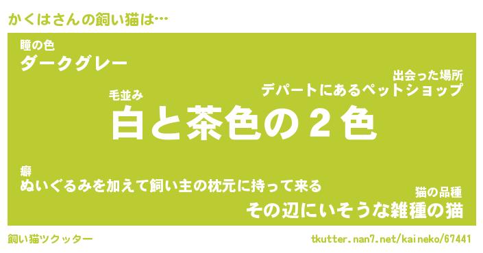 かくはさんの飼い猫は… 毛並み『白と茶色の2色』瞳の色『ダークグレー』猫の品種『その辺にいそうな雑種の猫』 ツクッター #飼い猫ツクッター http://tkutter.nan7.net/kaineko/67441/