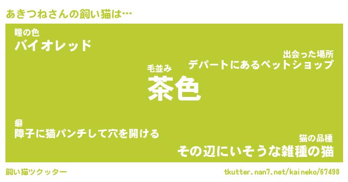 あきつねさんの飼い猫は… 毛並み『茶色』瞳の色『バイオレッド』猫の品種『その辺にいそうな雑種の猫』 ツクッター #飼い猫ツクッター http://tkutter.nan7.net/kaineko/67498/
