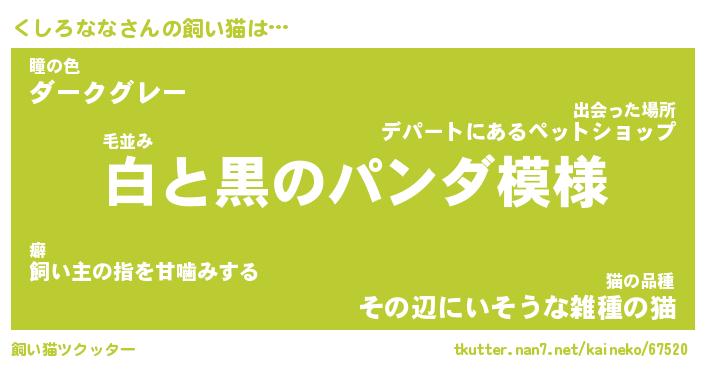 くしろななさんの飼い猫は… 毛並み『白と黒のパンダ模様』瞳の色『ダークグレー』猫の品種『その辺にいそうな雑種の猫』 ツクッター #飼い猫ツクッター http://tkutter.nan7.net/kaineko/67520/