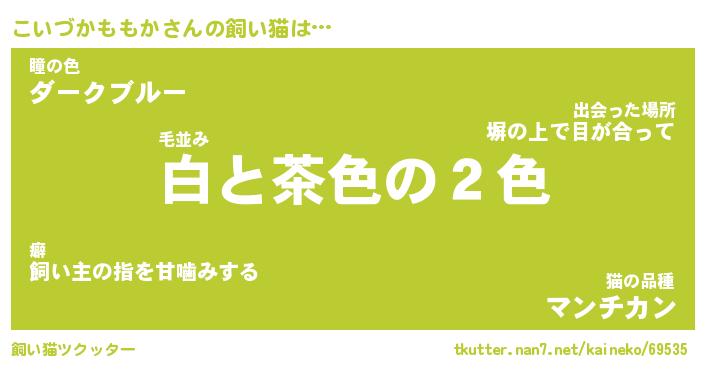 こいづかももかさんの飼い猫は… 毛並み『白と茶色の2色』瞳の色『ダークブルー』猫の品種『マンチカン』 ツクッター #飼い猫ツクッター http://tkutter.nan7.net/kaineko/69535/