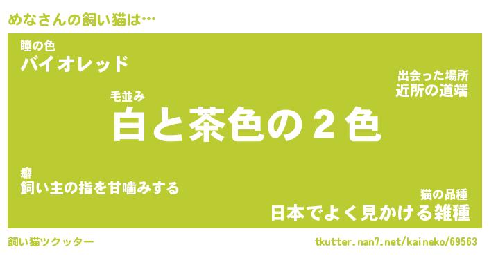 めなさんの飼い猫は… 毛並み『白と茶色の2色』瞳の色『バイオレッド』猫の品種『日本でよく見かける雑種』 ツクッター #飼い猫ツクッター http://tkutter.nan7.net/kaineko/69563/