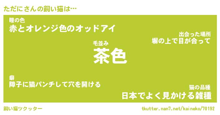 ただにさんの飼い猫は… 毛並み『茶色』瞳の色『赤とオレンジ色のオッドアイ』猫の品種『日本でよく見かける雑種』 ツクッター #飼い猫ツクッター http://tkutter.nan7.net/kaineko/70192/