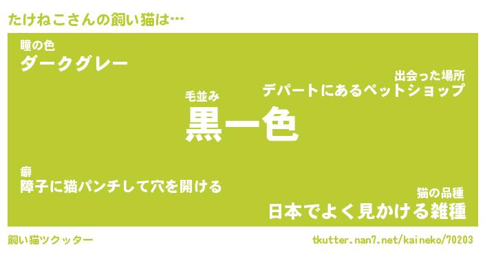 | 欧米人風あだ名 | 『マイケルたけねこ』『ウサインたけねこ』 |