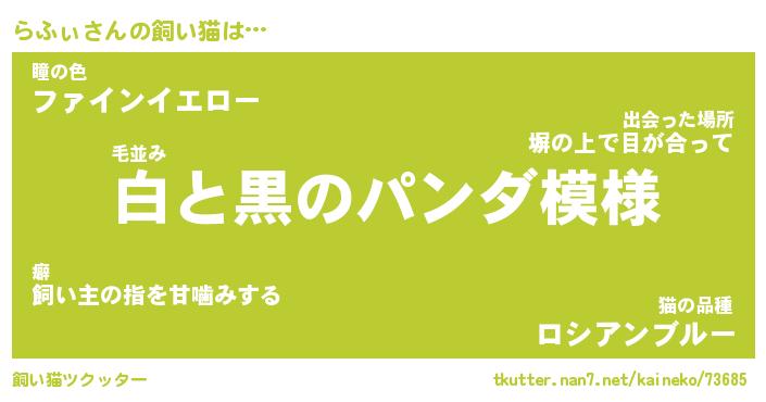 らふぃさんの飼い猫は… 毛並み『白と黒のパンダ模様』瞳の色『ファインイエロー』猫の品種『ロシアンブルー』 ツクッター #飼い猫ツクッター http://tkutter.nan7.net/kaineko/73685/