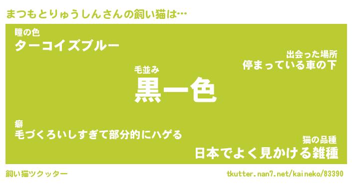 まつもとりゅうしんさんの飼い猫は… 毛並み『黒一色』瞳の色『ターコイズブルー』猫の品種『日本でよく見かける雑種』 ツクッター #飼い猫ツクッター http://tkutter.nan7.net/kaineko/83390/