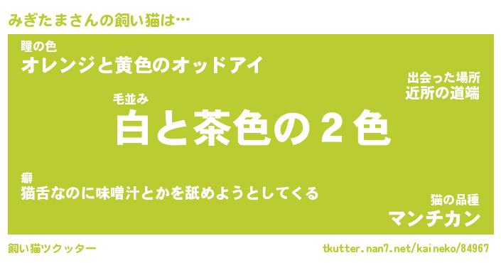 みぎたまさんの飼い猫は… 毛並み『白と茶色の2色』瞳の色『オレンジと黄色のオッドアイ』猫の品種『マンチカン』 ツクッター #飼い猫ツクッター http://tkutter.nan7.net/kaineko/84967/