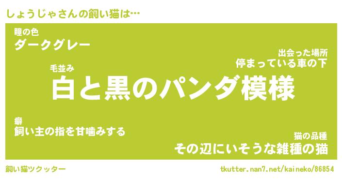 しょうじゃさんの飼い猫は… 毛並み『白と黒のパンダ模様』瞳の色『ダークグレー』猫の品種『その辺にいそうな雑種の猫』 ツクッター #飼い猫ツクッター http://tkutter.nan7.net/kaineko/86854/