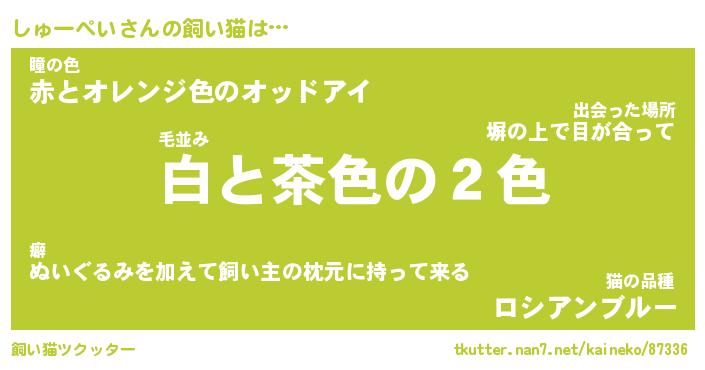 しゅーぺいさんの飼い猫は… 毛並み『白と茶色の2色』瞳の色『赤とオレンジ色のオッドアイ』猫の品種『ロシアンブルー』 ツクッター #飼い猫ツクッター http://tkutter.nan7.net/kaineko/87336/