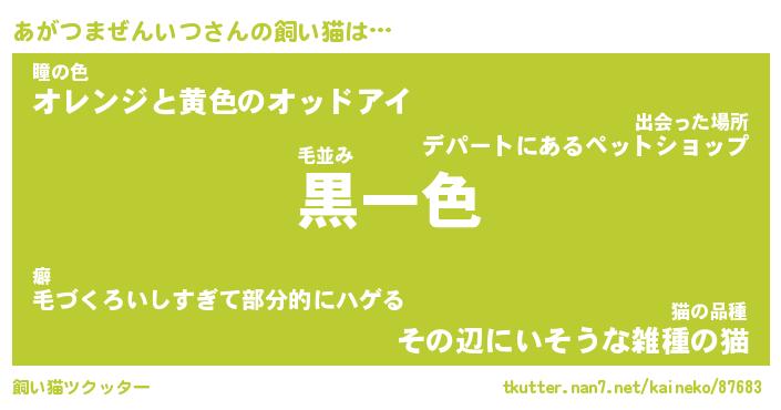 あがつまぜんいつさんの飼い猫は… 毛並み『黒一色』瞳の色『オレンジと黄色のオッドアイ』猫の品種『その辺にいそうな雑種の猫』 ツクッター #飼い猫ツクッター http://tkutter.nan7.net/kaineko/87683/