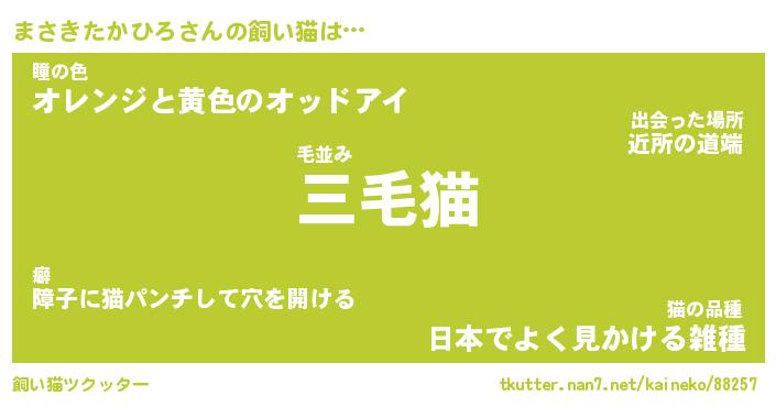 まさきたかひろさんの飼い猫は… 毛並み『三毛猫』瞳の色『オレンジと黄色のオッドアイ』猫の品種『日本でよく見かける雑種』 ツクッター #飼い猫ツクッター http://tkutter.nan7.net/kaineko/88257/
