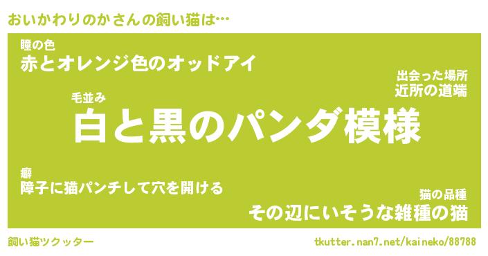 おいかわりのかさんの飼い猫は… 毛並み『白と黒のパンダ模様』瞳の色『赤とオレンジ色のオッドアイ』猫の品種『その辺にいそうな雑種の猫』 ツクッター #飼い猫ツクッター http://tkutter.nan7.net/kaineko/88788/