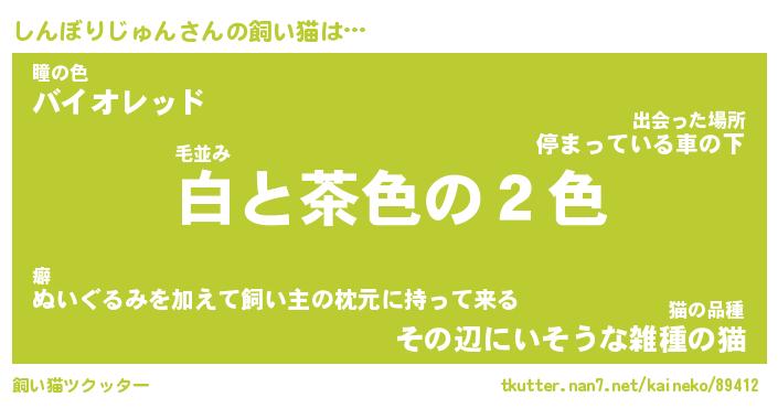 しんぼりじゅんさんの飼い猫は… 毛並み『白と茶色の2色』瞳の色『バイオレッド』猫の品種『その辺にいそうな雑種の猫』 ツクッター #飼い猫ツクッター http://tkutter.nan7.net/kaineko/89412/