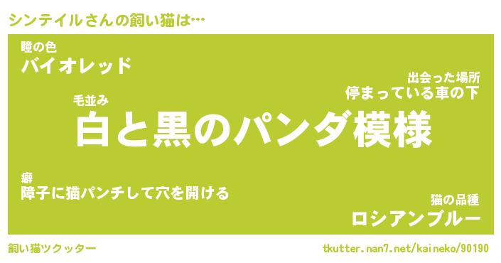 シンテイルさんの飼い猫は… 毛並み『白と黒のパンダ模様』瞳の色『バイオレッド』猫の品種『ロシアンブルー』 ツクッター #飼い猫ツクッター http://tkutter.nan7.net/kaineko/90190/