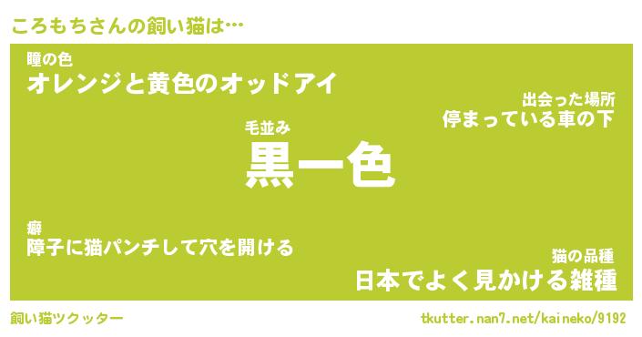 ころもちさんの飼い猫は… 毛並み『黒一色』瞳の色『オレンジと黄色のオッドアイ』猫の品種『日本でよく見かける雑種』 ツクッター #飼い猫ツクッター http://tkutter.nan7.net/kaineko/9192/