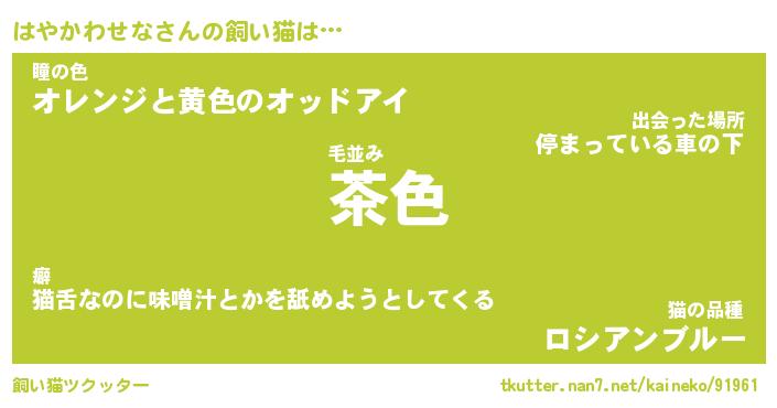 はやかわせなさんの飼い猫は… 毛並み『茶色』瞳の色『オレンジと黄色のオッドアイ』猫の品種『ロシアンブルー』 ツクッター #飼い猫ツクッター http://tkutter.nan7.net/kaineko/91961/